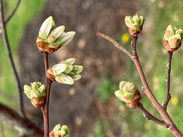Our Legacy blueberries, while not early berries, are early bloomers. Every Spring, they push ahead while frosts are still likely. Plants in the "closed flower" stage above can tolerate temperatures down to 24 degrees. March always brings crop risks!